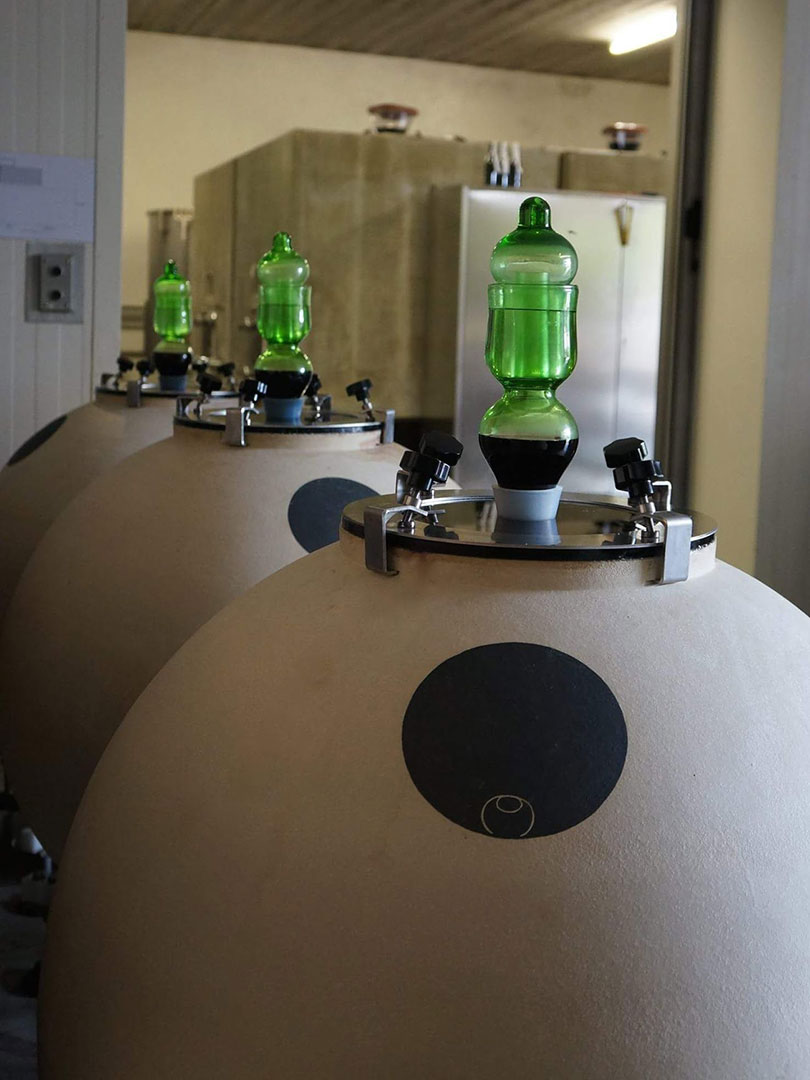 Das thermische Verhalten des Weines, hervorgerufen durch die Eiform, bringt klare, ausdrucksstarke Fruchtkomponenten der Trauben zu Tage – der Wein dreht sich von selbst spiralförmig.